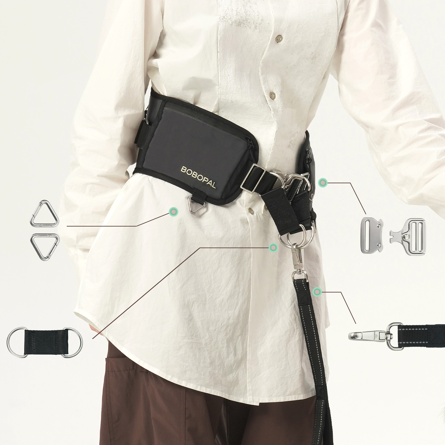 Premium hardware includes: connector buckle, quick-release tactical buckle, triangular swivel buckle, car seatbelt clip, and small D-ring. |